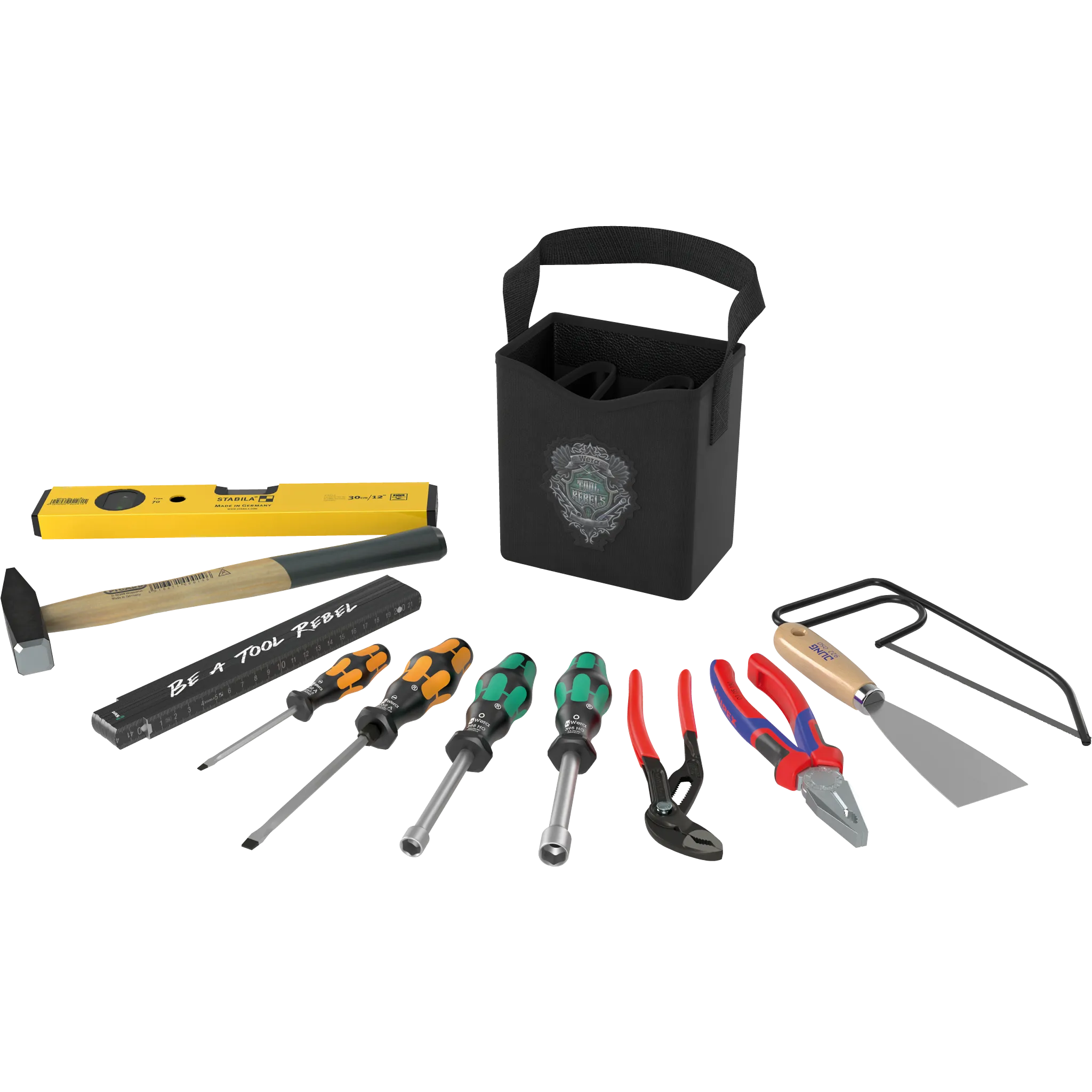 Das Haushalt Set 3 ist die ideale Erweiterung für Dein Zuhause und Deine Werkstatt. Im Wera 2go Köcher im Tool Rebel Design findest Du eine erstklassige Werkzeugzusammenstellung: Zwei Wera Hohlschaft-Schraubendreher für Sanitäranwendungen, zwei robuste Wera Schraubmeißel Schraubendreher, einen Tool Rebel Zollstock, eine hochwertige Stabila Wasserwaage, zwei Knipex Zangen, einen Picard Hammer, einen Jung Malerspachtel und eine PUK Kleinsäge. Perfekt als Ergänzung zu unseren Haushalt Sets – für noch mehr Vielseitigkeit und Flexibilität bei Reparaturen, Montagen und DIY-Projekten!