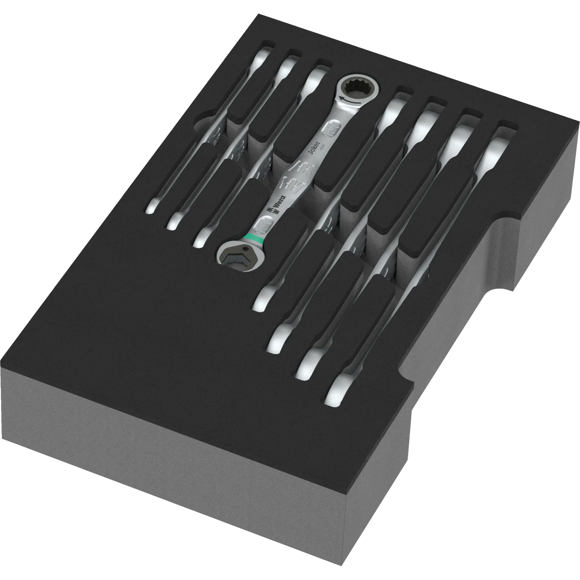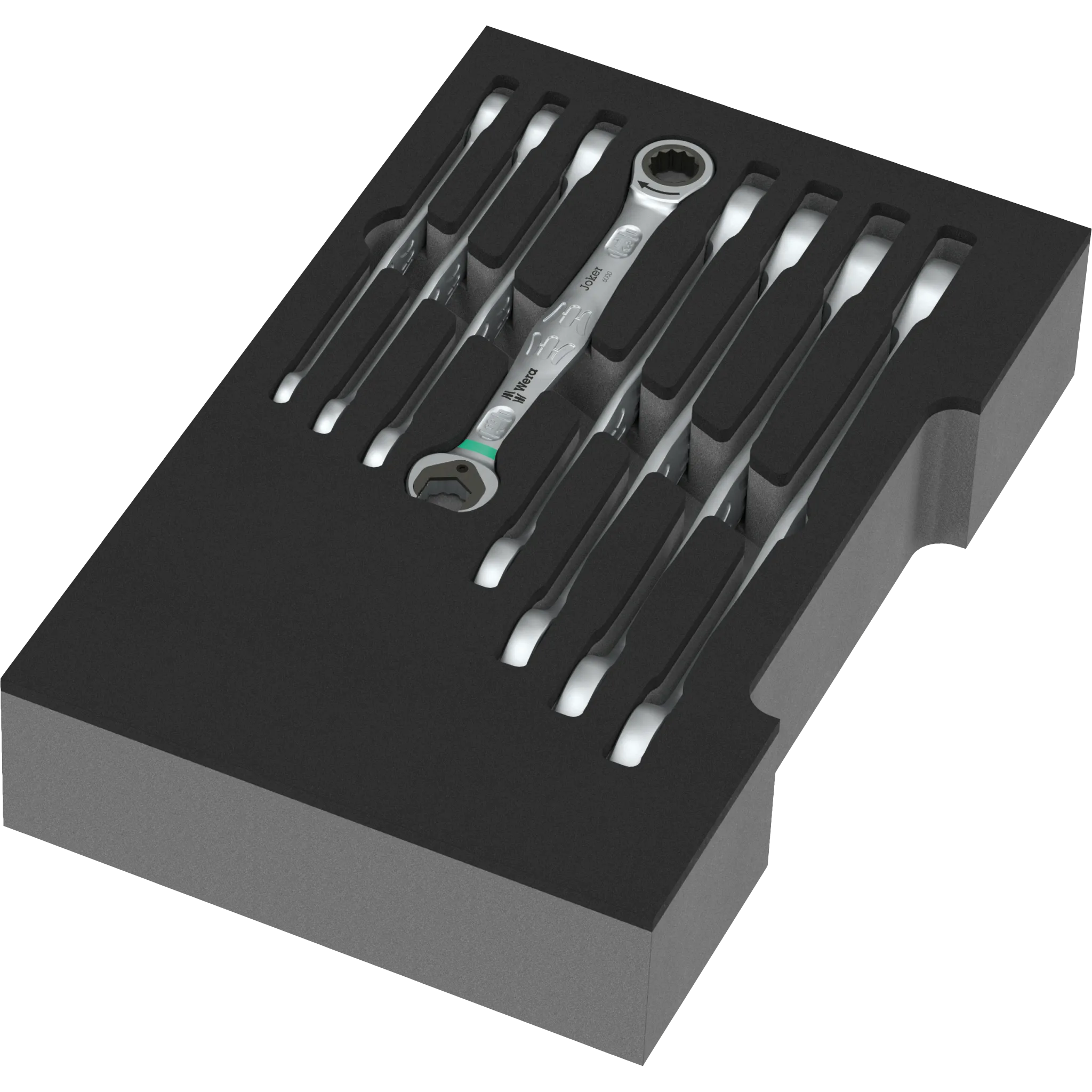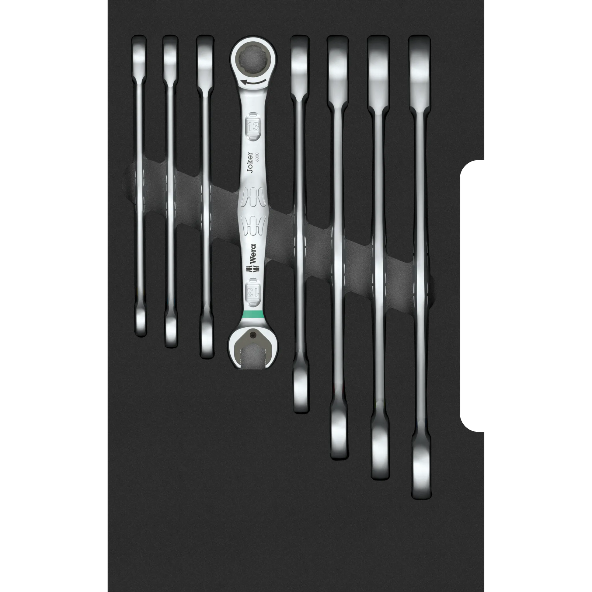 Mit dem Joker 6000 Ringratschen-Maulschlüssel Set in Schaumstoffeinlage bekommst Du acht der beliebtesten Schlüsselgrößen perfekt organisiert in Deine L-Boxx. Die hochwertigen Maul-Ringratschen-Schlüssel von Wera sind echte Multitalente: Mit Haltefunktion, Endanschlag, feiner Ratschenmechanik und der typischen Joker-Maulgeometrie bist Du jeder Verschraubung und engsten Bauräumen gewachsen.