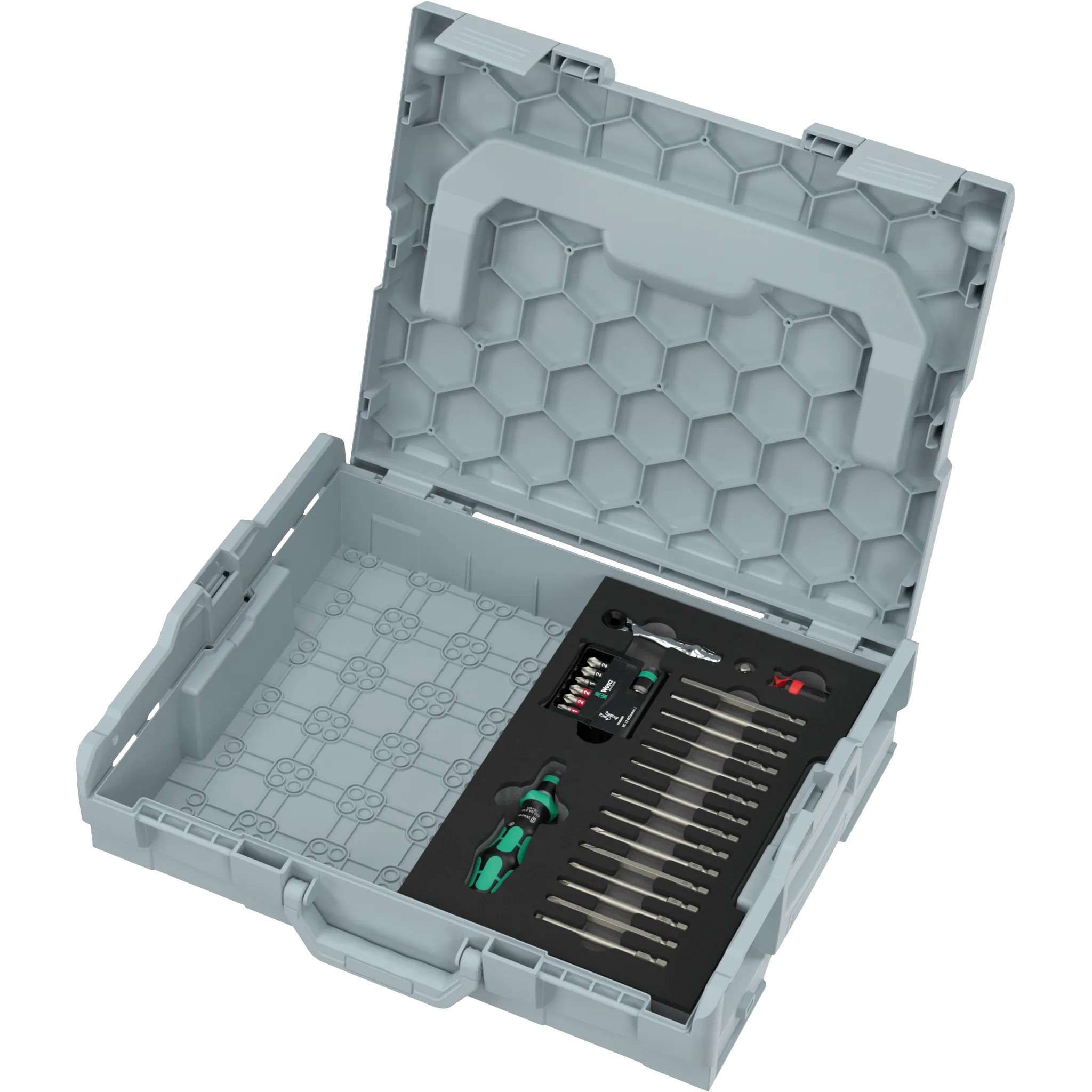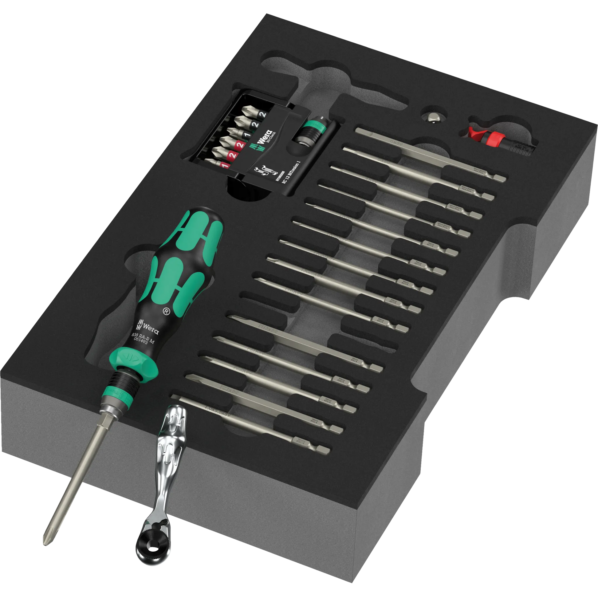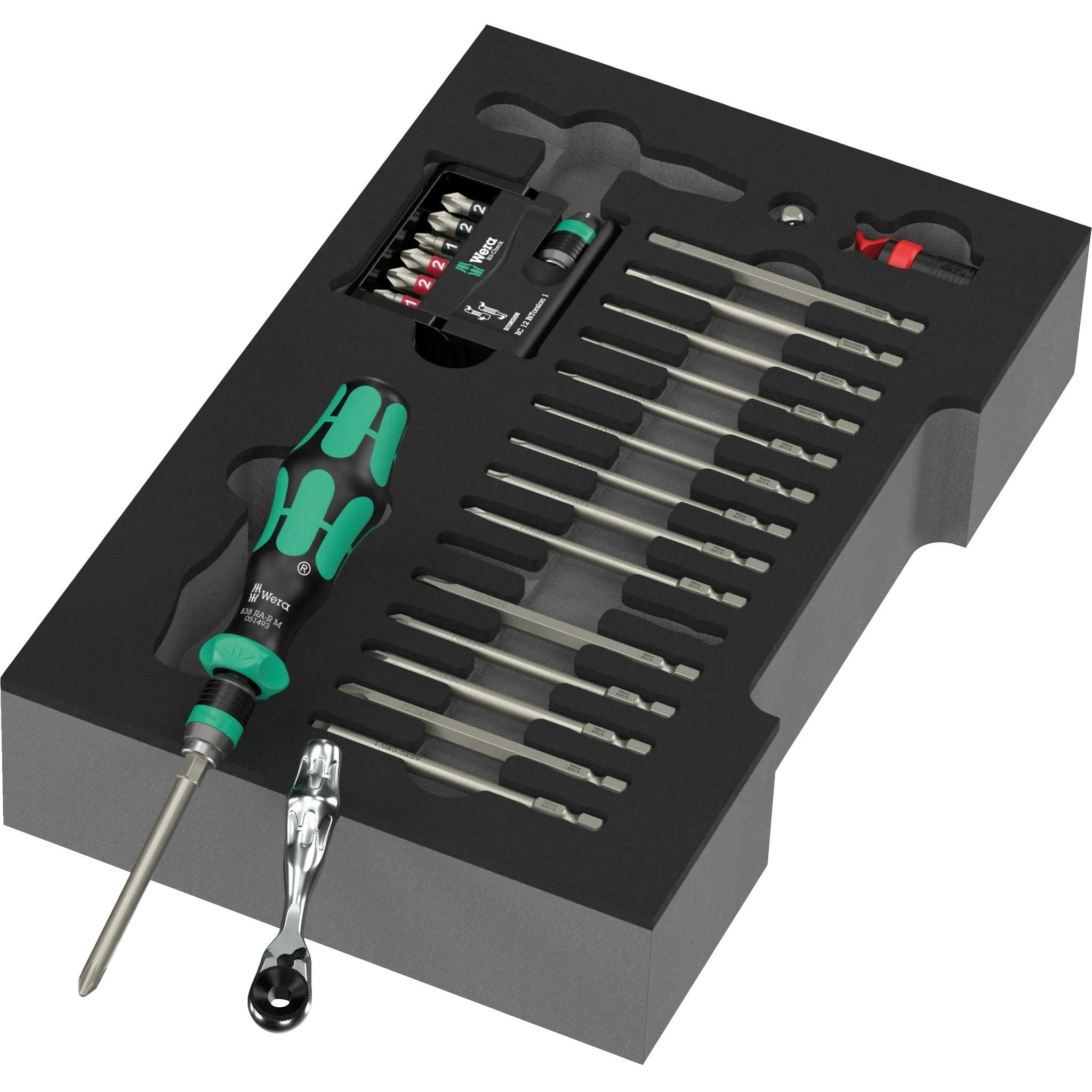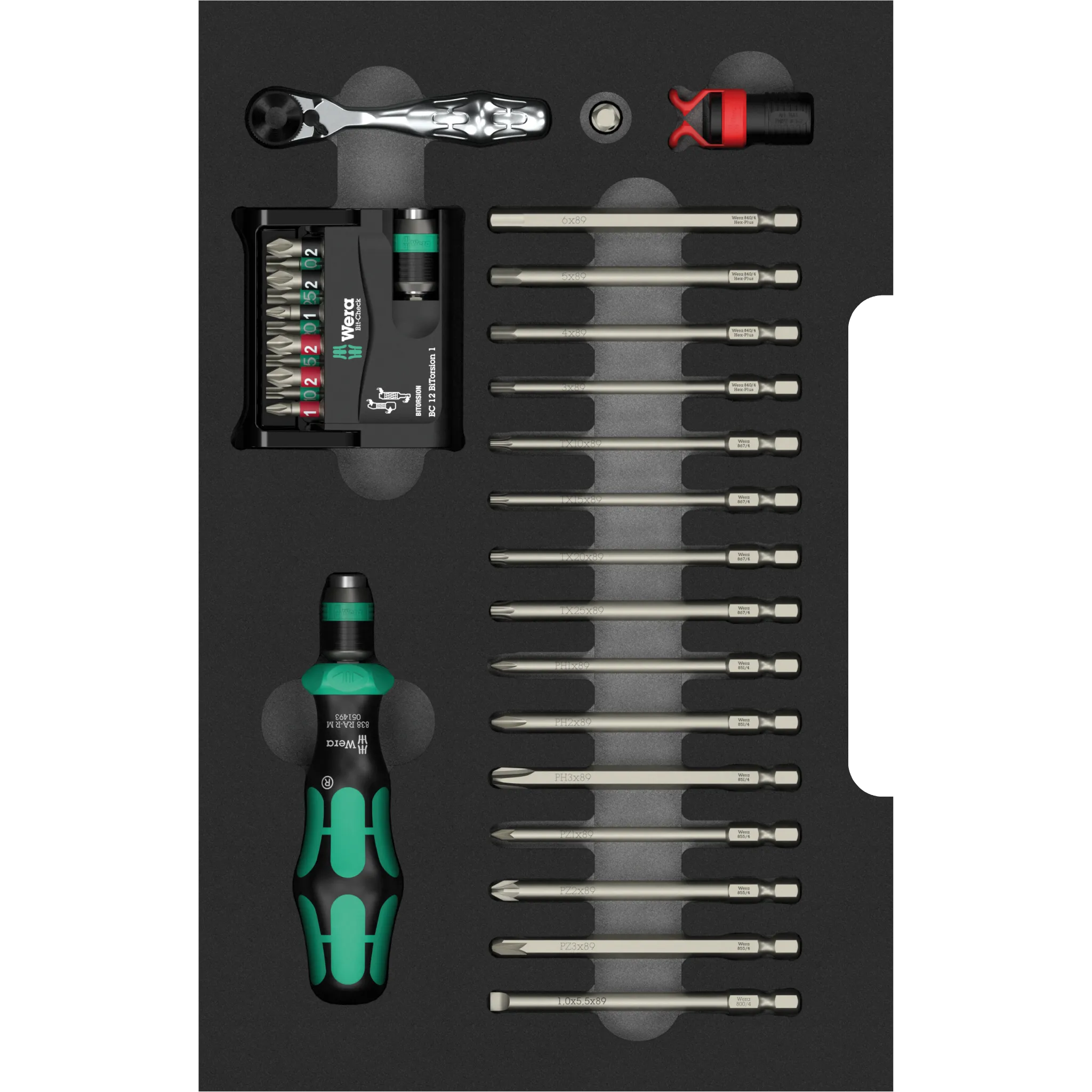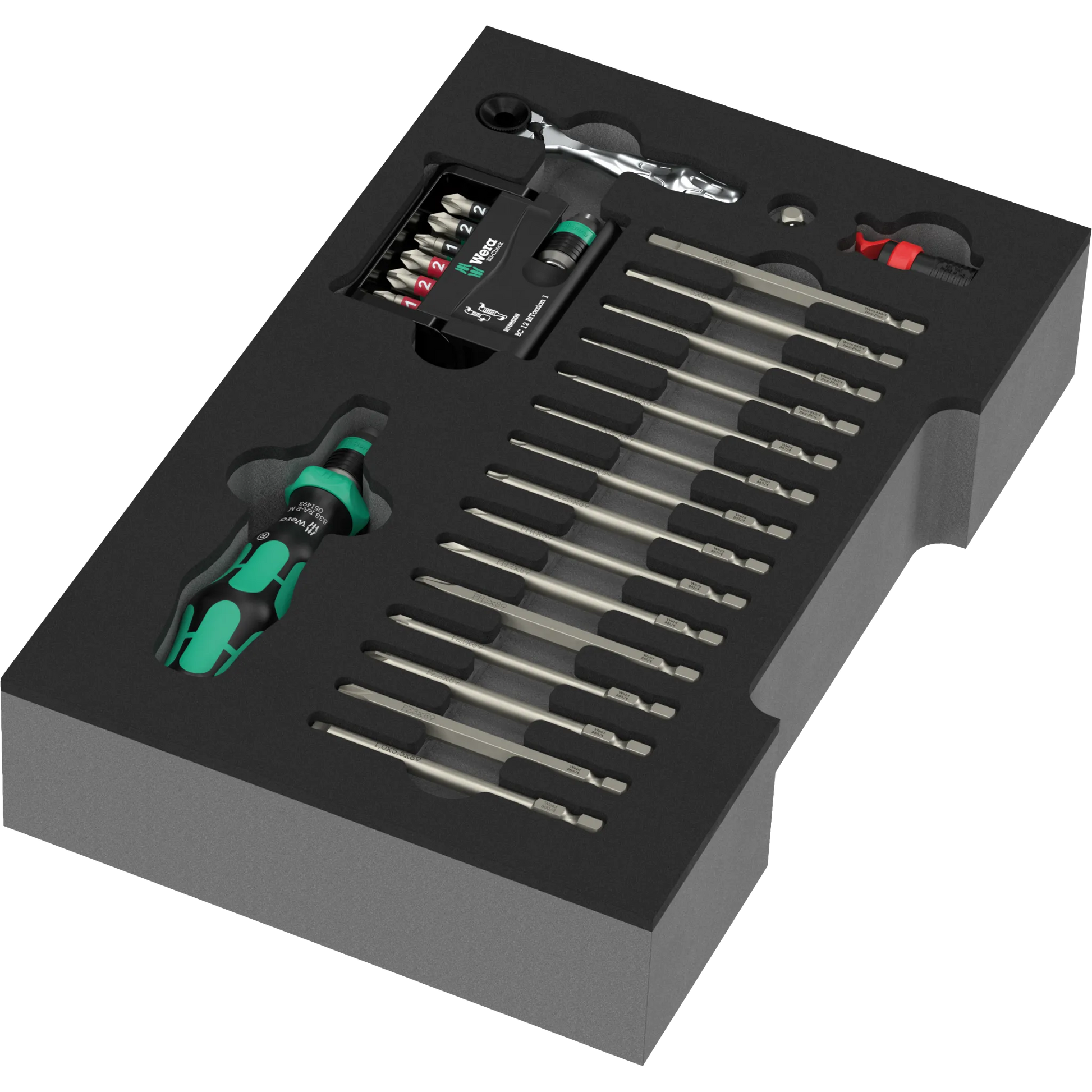 Das Schraubendreher Wechselklingen Set in Einlage vereint flexible Wechselklingen mit einem Handhalter mit Ratschenfunktion – ideal für enge Stellen und zügiges Arbeiten. Der Bit-Check liefert Dir die gängigen Profile, die Zyklop Mini Bit-Ratsche glänzt immer dann, wenn wenig Platz ist. Mit dem Rapidaptor wechselst Du Bits in Sekunden - sowohl per Hand als auch mit dem Akkuschrauber. Alles liegt übersichtlich in der Schaumstoffeinlage, griffbereit für Werkstatt, Service oder Deine Projekte Zuhause. Und auch passend für die L-Boxx Welt. Kompakt, robust und typisch Wera.