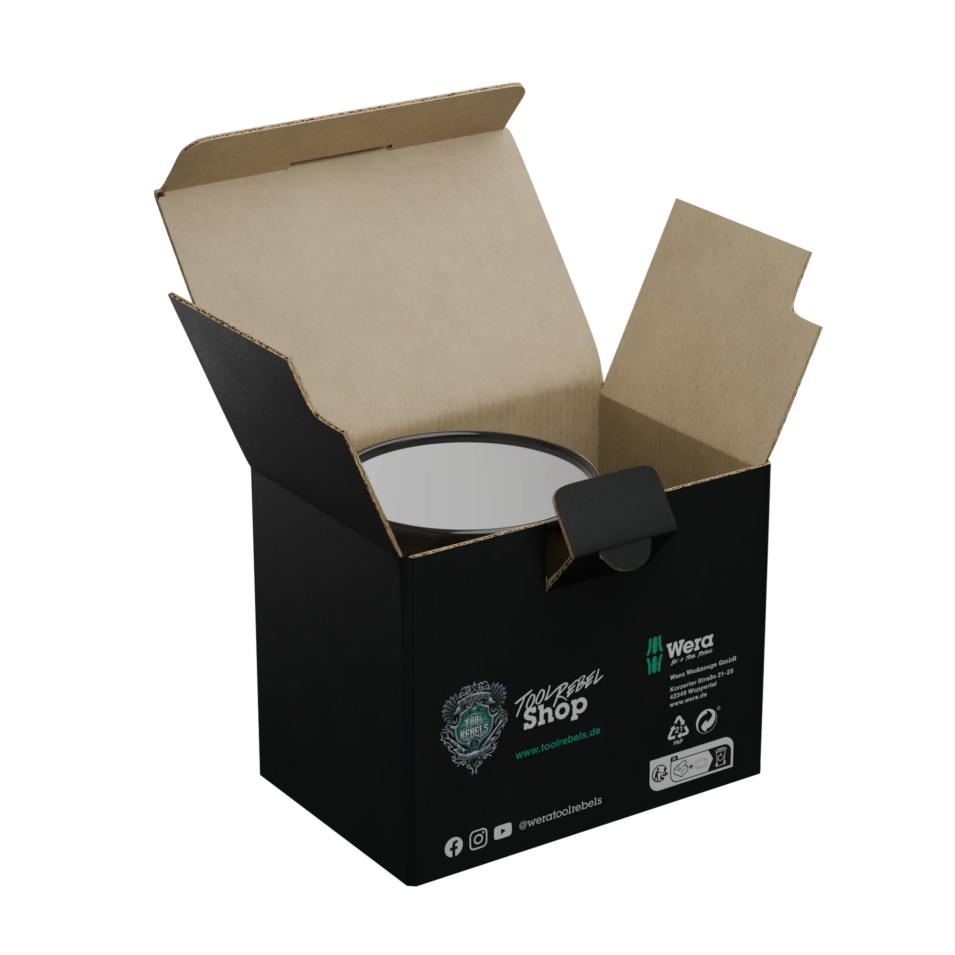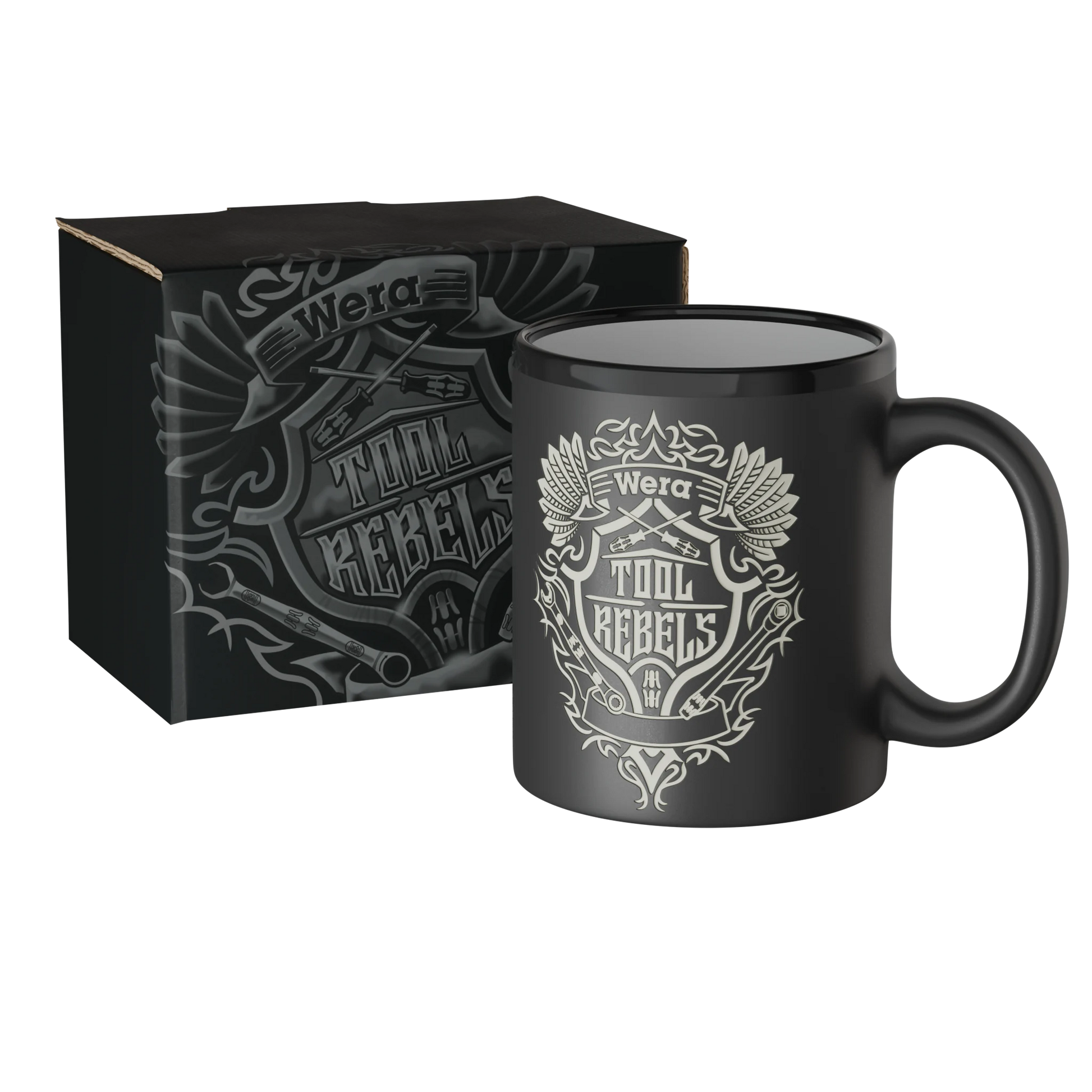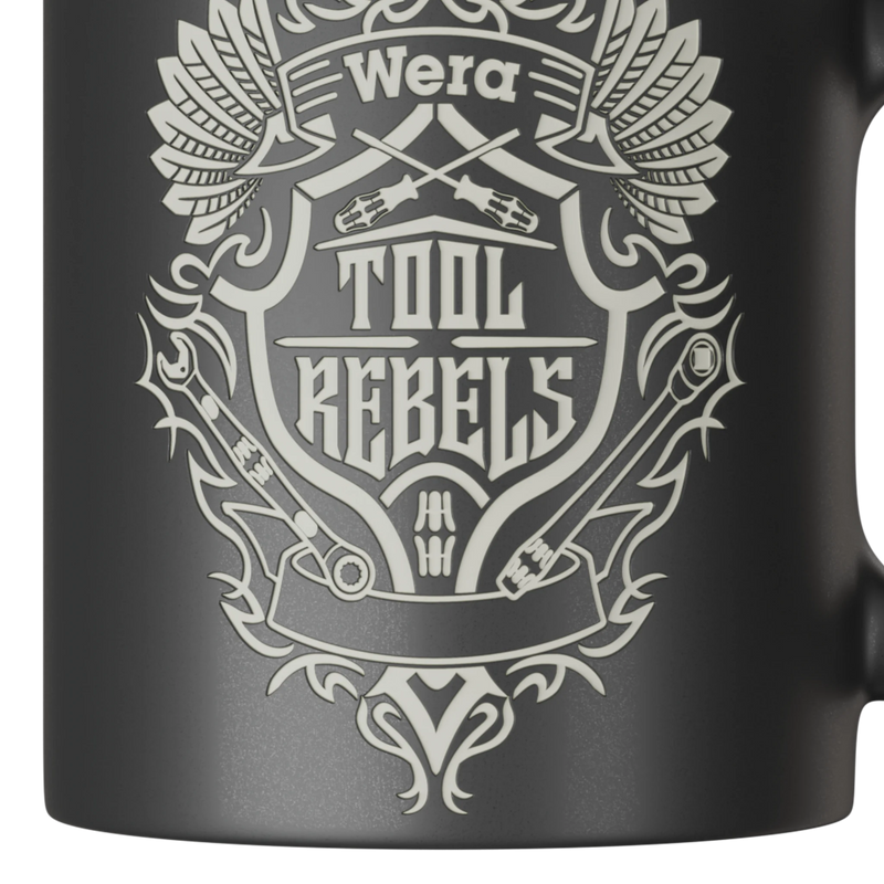 Zeig Deinen Tool Rebel Spirit mit der Wera Tool Rebel Tasse! Diese hochwertige, schwarze Tasse aus robuster Keramik ist mit einem 3D-gefrästen Wera Tool Rebel Logo versehen, das für echte Hingucker sorgt. Perfekt für Deinen täglichen Kaffee oder Tee und dank ihrer robusten Bauweise besonders langlebig. Optional kannst Du die Tasse mit einer persönlichen Lasergravur versehen und so ein echtes Unikat schaffen. Das matte Finish verleiht der Tasse eine moderne, stylische Optik, die sowohl auf Schreibtischen als auch Werkbänken gut aussieht!