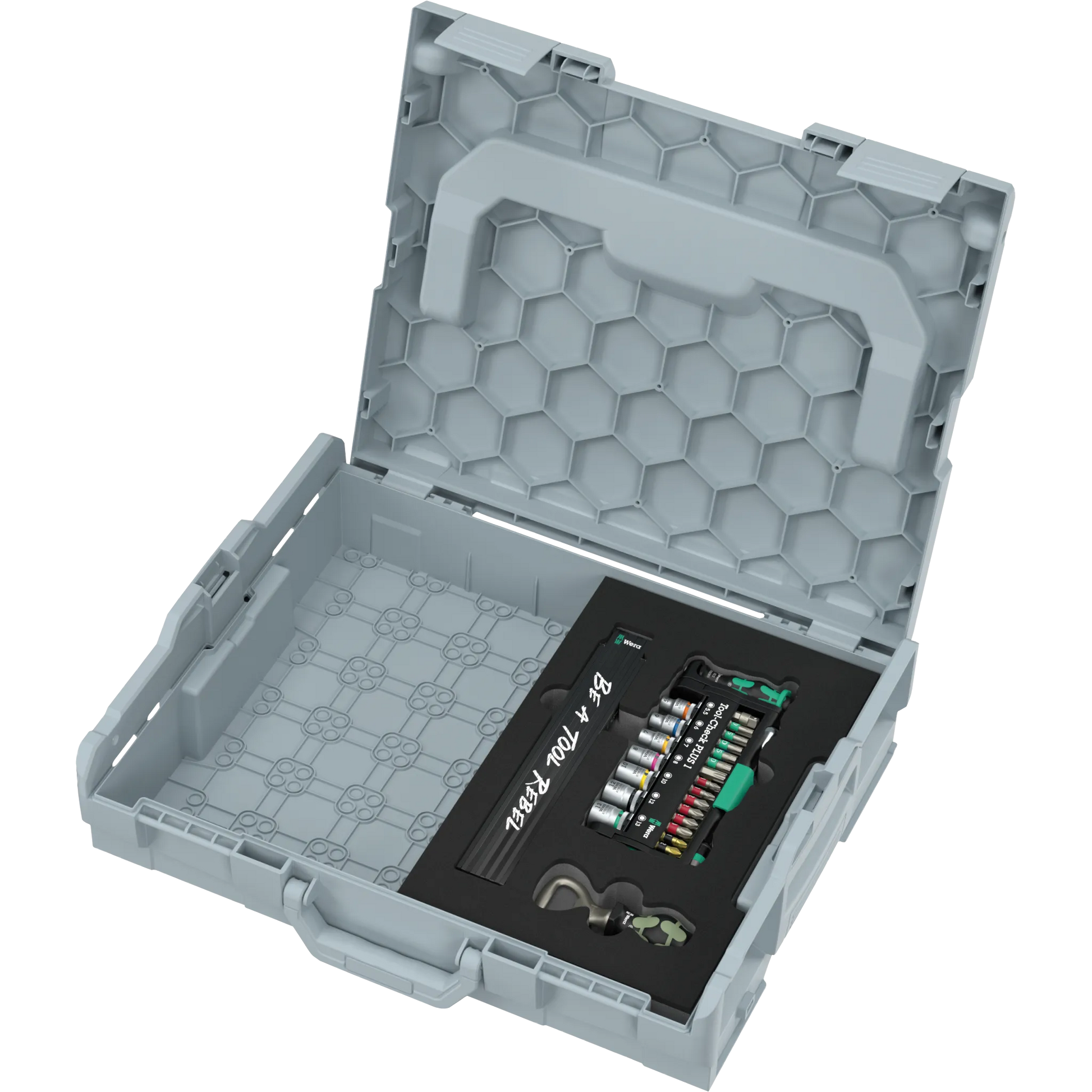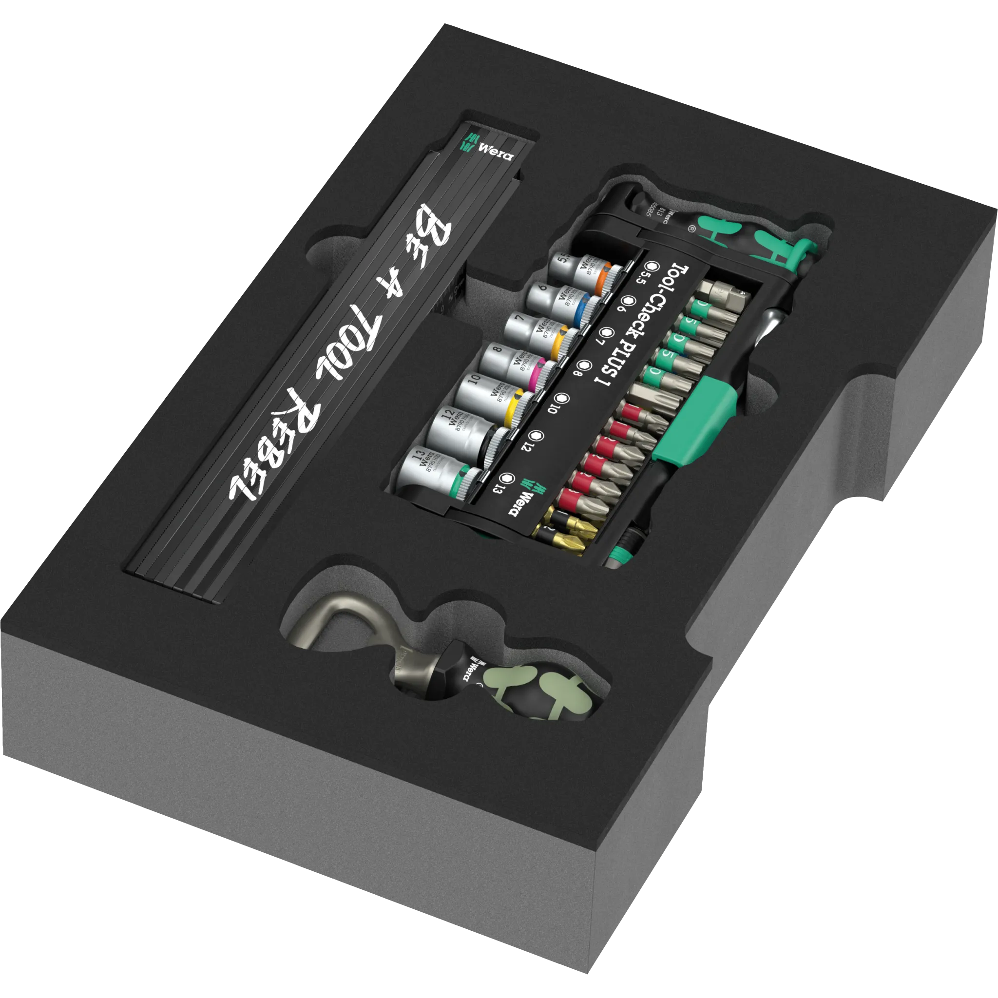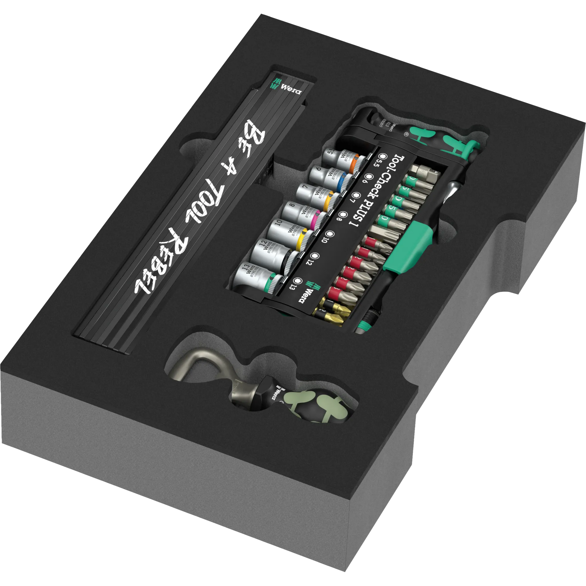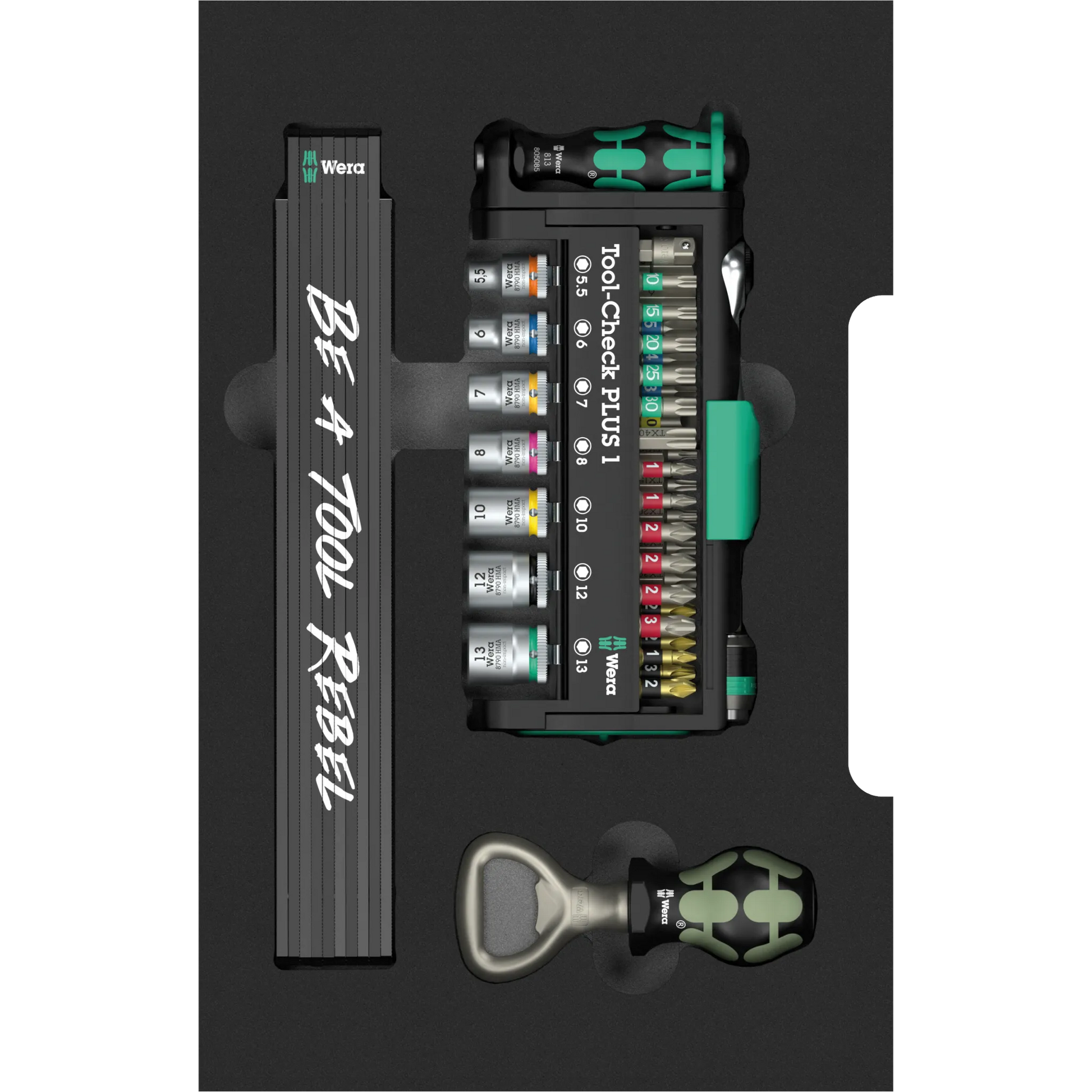Das Tool-Check PLUS Set in Einlage ist Dein kompaktes Allround-Paket: Bits, Handhalter, Zyklop Mini-Ratsche und Nüsse für viele Aufgaben – übersichtlich im Tool-Check PLUS organisiert. Dazu kommen zwei Extras, die Spaß machen: ein Zollstock im Tool-Rebel-Design und ein Flaschenöffner. Ideal für kleine Reparaturen, Projekte in Haus und Werkstatt oder als hochwertiges Geschenk. Dank Schaumstoffeinlage bleibt alles an seinem Platz – rausnehmen, arbeiten, wieder einlegen. Schnell, ordentlich, original Wera.