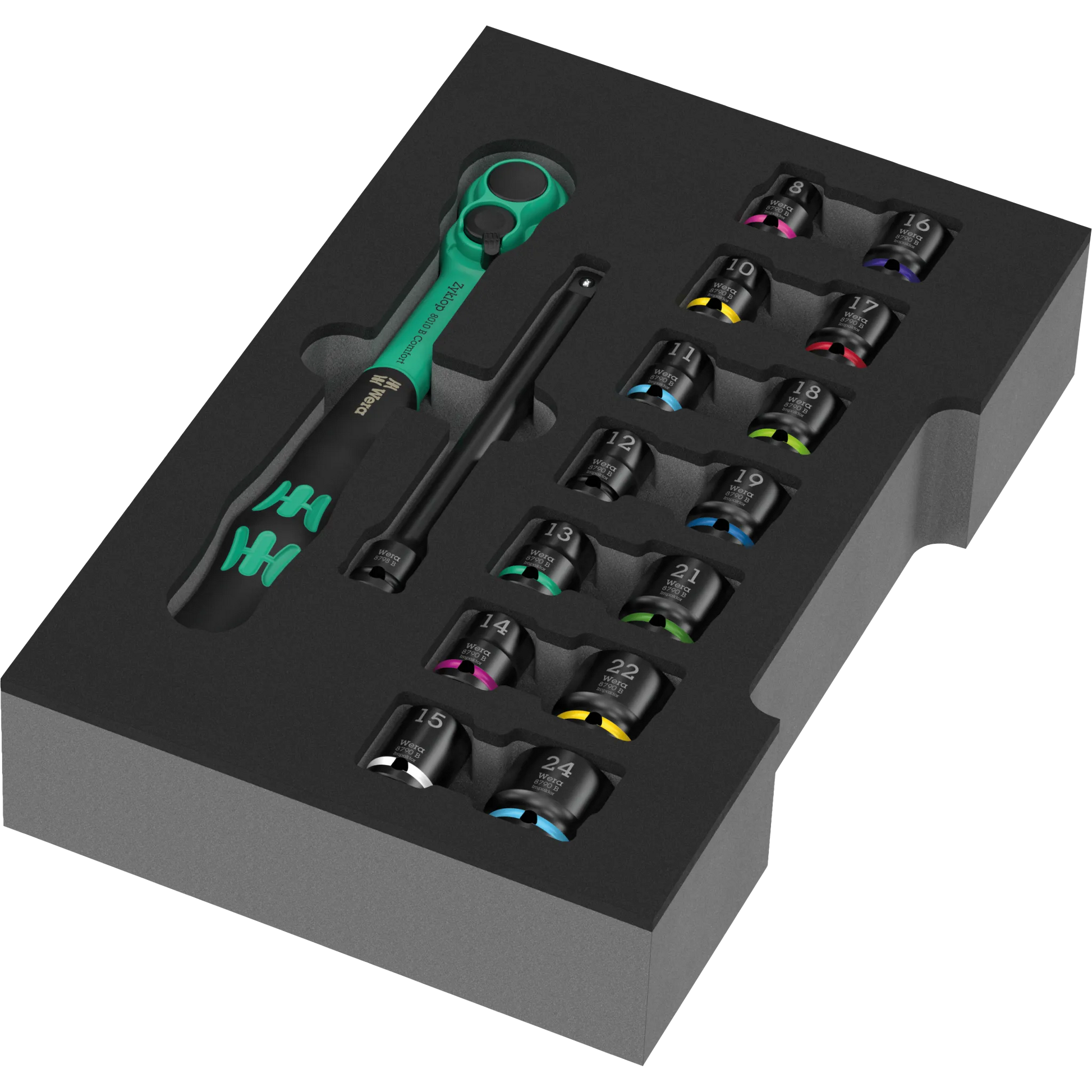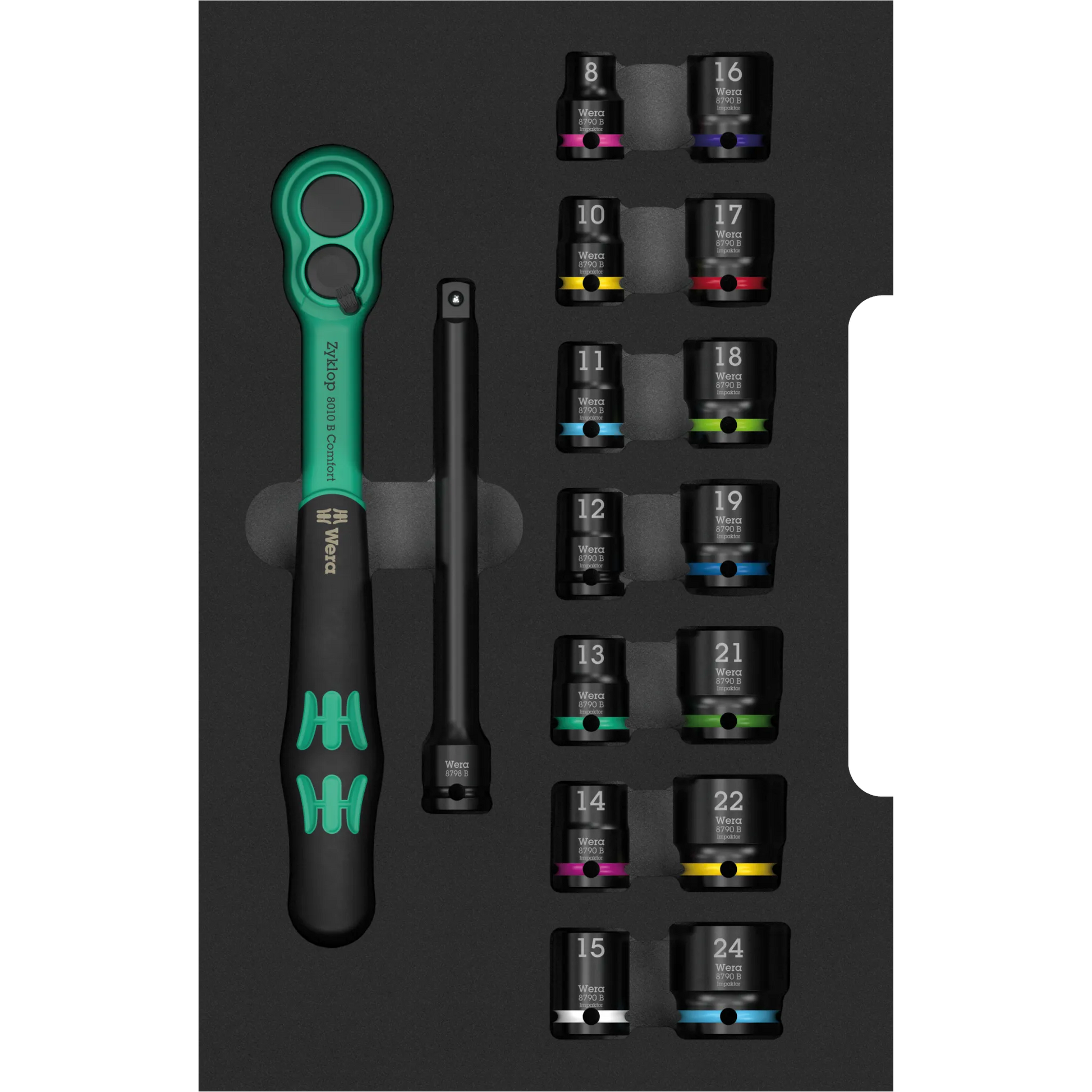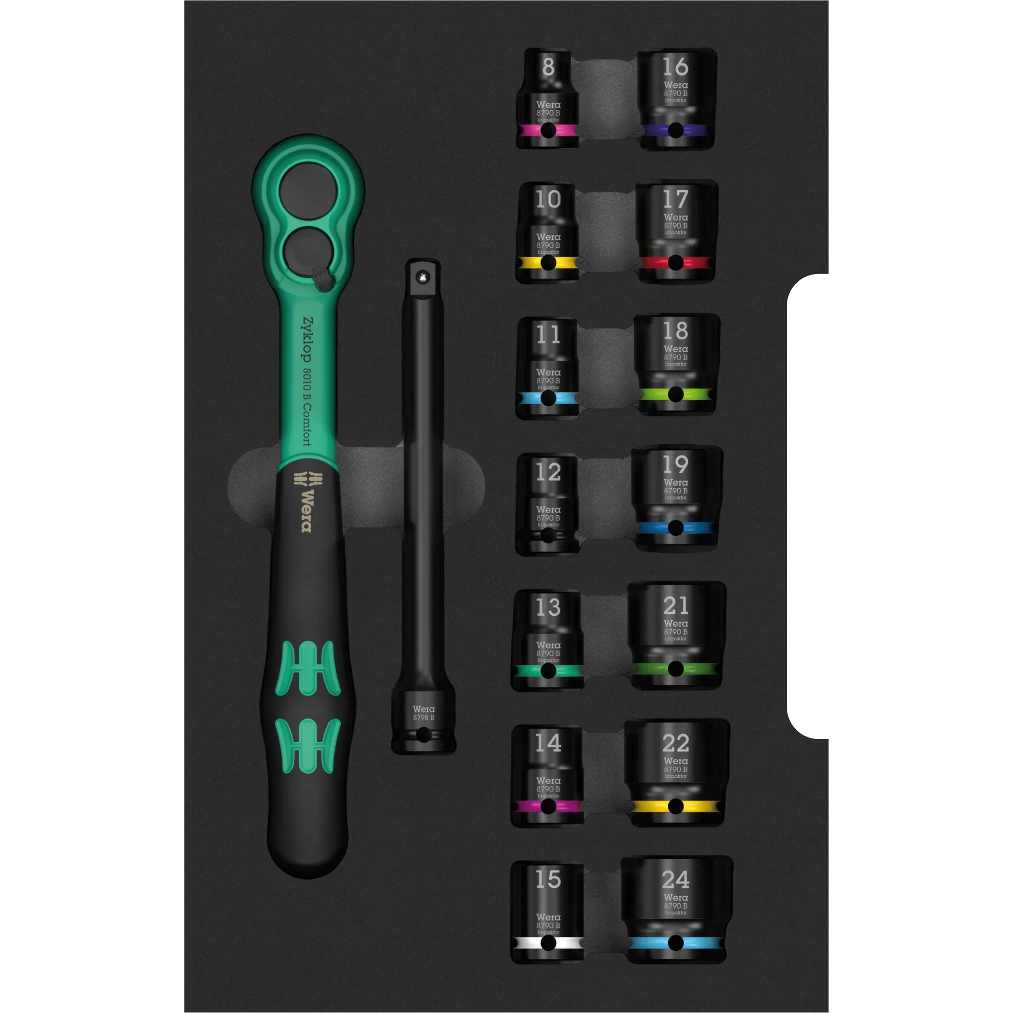 Das Zyklop Comfort Knarren Set 3/8 Zoll in Einlage liefert Dir eine ganz besondere 3/8 Zoll Knarre mit angenehmem Komfortgriff und einer handschmeichelnden Vollummantelung. Dazu eine Verlängerung und Nüsse von 8 bis 24 mm. Für Projekte in Haus und Werkstatt hast Du damit die gängigen Größen sofort parat – griffig, präzise und schnell. Die Schaumstoffeinlage hält alles übersichtlich an Ort und Stelle, ob in der Werkbank-Schublade, im mobilen Koffer oder in deiner L-Boxx. Ein Set, das gut in der Hand liegt und Deine Arbeit spürbar angenehmer macht – täglich einsatzbereit, typisch Wera.