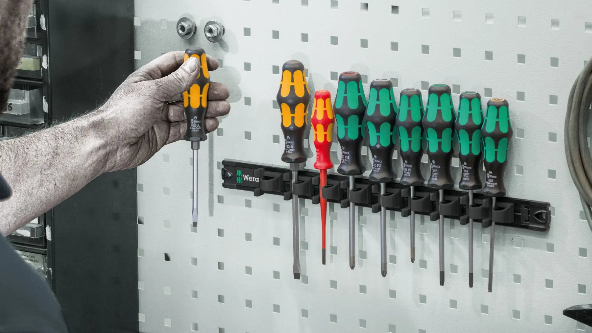 Mit unserer magnetischen Werkzeug Halterung für Schraubendreher bringst Du Ordnung in Deine Werkstatt – und das mit Stil. Die Klemmleiste bietet Platz für bis zu 9 Wera Schraubendreher, die dank starker Klemmen festgehalten und gleichzeitig leicht entnommen werden können. Die Leiste hält aufgrund des starken Magneten sicher an Metallflächen. Alternativ lässt sich die Halterung an den dafür vorgesehenen Schraublöchern auch ganz einfach an der Wand verschrauben. Die Werkzeug Halterung ist robust, praktisch und sorgt für griffbereite und geordnete Schraubendreher!